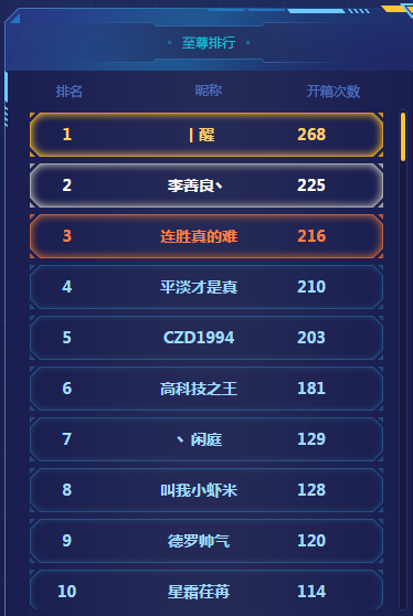 至尊宝箱之拂晓高达首周排行榜竞争激烈,首批20份终极皮肤也已经被尽数收入囊中,活动刚过一周,接下来的排名情况将如何变化,让我们拭目以待!本次活动结束后排行榜前300玩家均有奖励,2款至宝精美特效准备就绪,排名第1名的玩家更可直接联系我们获得专属定制皮肤!每日开箱榜可获得额外至尊宝箱奖励!快来一起冲榜吧~